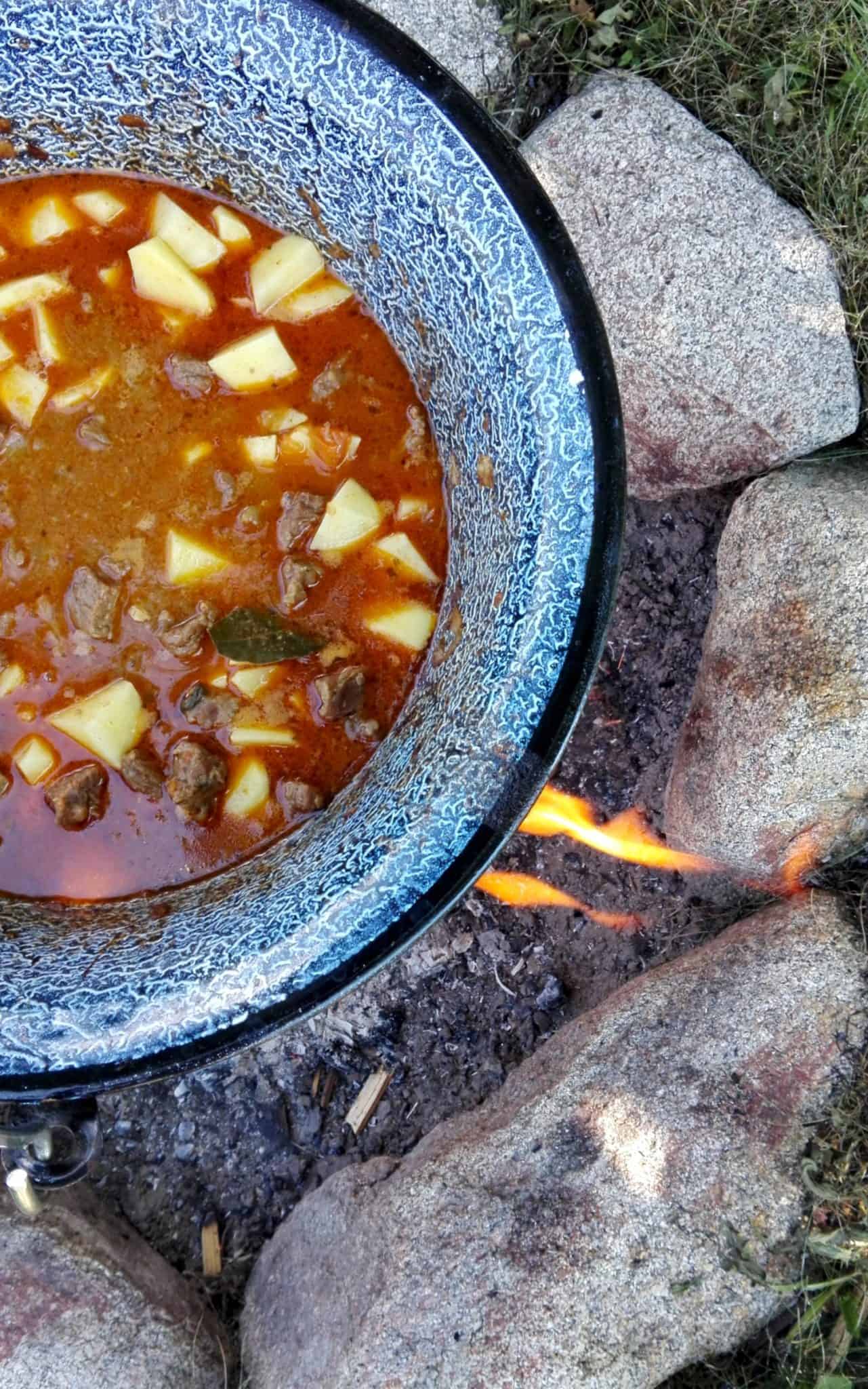 5. Keď nám guláš začne znovu vrieť, prilejeme vínko a varíme až do zmäknutia zemiakov.