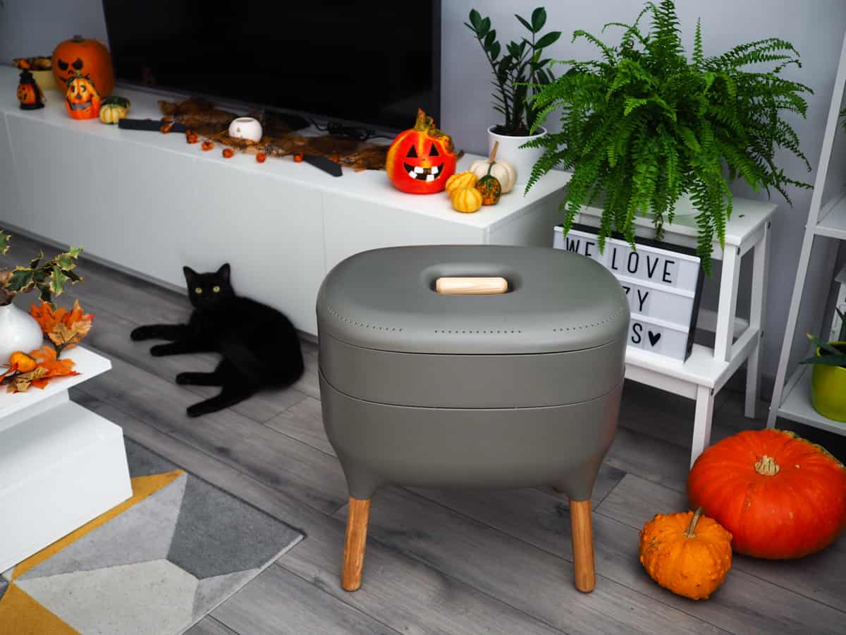 Vermikompostér Urbalive Komplet dostať v 4 farbách a keďže náš byt je ladený do sivo-biela, voľba bola jasná. Sivý kompostér dokonale zapadol k nášmu sivému gauču a k mojej mini džungli, ktorú si pestujem v obývačke. 🙂 Skladá sa z 2 poschodí, ktoré si však môžete dokupovať. Sú prikryté vekom, takže sa nemusíte obávať, že by dážďovky mohli ujsť. A okrem toho, kam by aj chodili? Každý predsa vie, že dážďovky sú najradšej pod zemou, vo vlhkosti ďaleko od svetla. V najspodnejšej nádobe je filtračné sitko a na jej spodku je malý ventil, z ktorého časom (cca po 2-3 mesiacoch) vypúšťame vytvorené tekuté hnojivo, tzv. dážďovkový čaj. To je potom vhodné napríklad na zalievanie alebo ako postrek izbových rastlín.