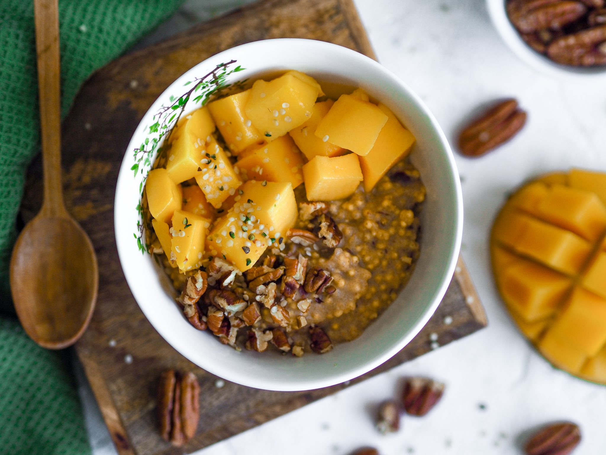 Príprava tejto kaše je veľmi jednoduchá. Pšeno prepláchneme, zalejeme rastlinným mliekom, pridáme medjool datle a varíme kým kaša nebude krémová. Potom už iba ľubovoľne ozdobíme. Ja som dnes zvolila pekanové orechy, konopné semienka a čerstvé ready to eat mango.